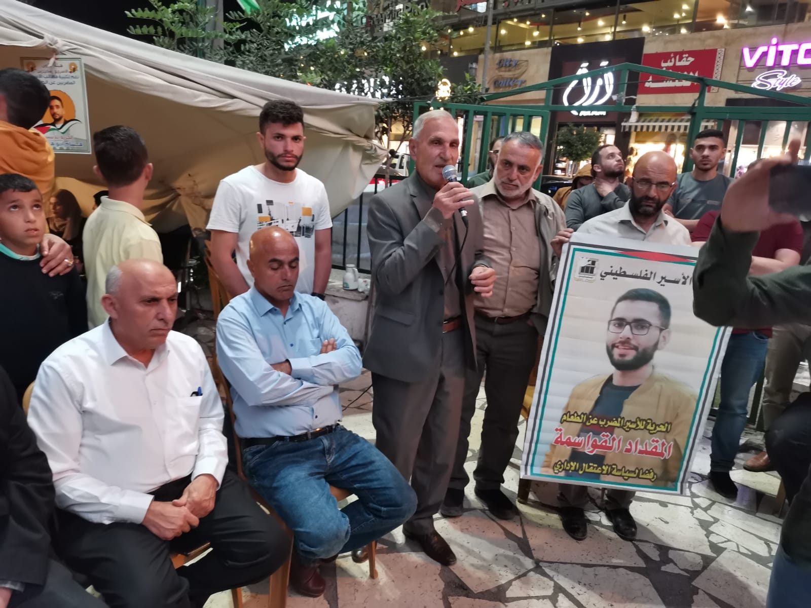 وكان في استقبال الوفد في الخيمة والد الأسير المضرب عن الطعام المقداد عمر القواسمي ومساعد محافظ محافظة الخليل رفيق الجعبري وعضو بلدية الخليل مدير التربية والتعليم سابقاً محمد القواسمة.